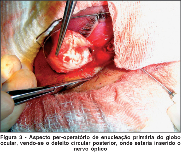 Devido à marcante presença do projétil retrobulbar e à impossibilidade de recuperação funcional do olho, o paciente foi operado sob anestesia geral, para se completar a enucleação (Figura 3), com ligadura e ressecção dos músculos retos, remoção do projétil e sutura da cavidade em três planos: