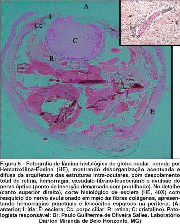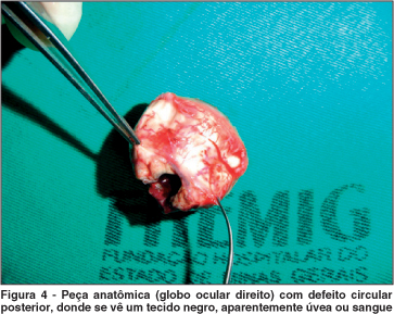 A peça anatômica (Figura 4) mostrava o defeito circular completo na esclera posterior, no lugar onde o nervo óptico e sua bainha estariam inseridos. Um tecido negro (aparentemente úvea ou sangue) era visível através deste buraco. O exame anátomo-patológico encontra-se detalhado na legenda da figura 5.