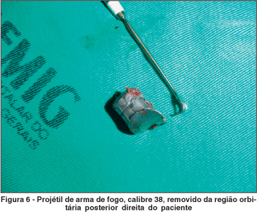 No caso em questão, esta força propulsora foi gerada pelo projétil de arma de fogo que, ao adentrar a região orbitária posterior, projetou o globo ocular para frente, rompendo, desta forma, as fibras nervosas do nervo óptico, junto à sua inserção posterior (Figuras 1 a 6).
