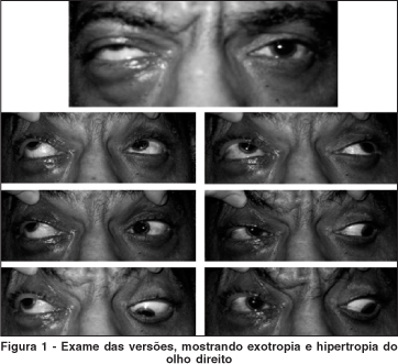 Paciente de 58 anos notou proptose progressiva no olho direito e diplopia vertical há 3 meses. Como antecedente pessoal relevante referia tabagismo por 30 anos. Ao exame oftalmológico apresentava acuidade visual com melhor correção de 20/30 no olho direito (OD) e 20/20 no olho esquerdo (OE). Apresentava defeito pupilar aferente relativo e proptose com aumento da resistência a retropulsão à direita, com exoftalmometria de Hertel de 32 mm (OD) e 20 mm (OE). A avaliação da motilidade ocular evidenciou uma exotropia e hipertropia do olho direito com restrição a infradução do OD (Figura 1). Não foram observadas alterações na biomicroscopia. O exame fundoscópico revelou papila elevada, com limites borrados, associada a dobras de coróide e tortuosidade venosa no olho direito e olho esquerdo sem alterações.