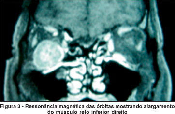 Proptose e diplopia decorrentes do alargamento de músculo extra-ocular representam sinais importantes em várias afecções da órbita. Embora a causa mais comum de alargamento de músculo extra-ocular seja a orbitopatia distireoidiana onde o diagnóstico é estabelecido pelo quadro clínico característico associado aos achados radiológicos e laboratoriais, nas formas atípicas a diferenciação com outras causas de alargamentos dos músculos retos se torna menos evidente. O diagnóstico diferencial destas doenças é extenso e inclui: miosite inflamatória idiopática, granulomatose de Wegener, sarcoidose, triquinose e outras parasitoses, fístula carótido-cavernosa, metástases, tumores linfóides além de tumores primários(1-13). Nestas afecções o acometimento dos músculos é difuso envolvendo mais de um músculo extra-ocular e não raro em ambas as órbitas. O aumento de volume de um único músculo extra-ocular pode sugerir a existência de um tumor primário de órbita como descrito no rabdomiossarcoma, lipossarcoma, tumor de granulócitos e sarcoma alveolar de tecidos moles(9,12) embora também possa ocorrer nos tumores metastáticos ou até mesmo na orbitopatia distireoidiana e no pseudotumor orbitário.