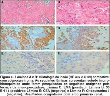 Submetido a avaliação sistêmica, verificou-se massa no pólo inferior do rim esquerdo sugestivo de tumor de células renais e múltiplos nódulos pulmonares sugestivo de metástases. Foi realizada a biópsia do músculo reto inferior através de uma orbitotomia transconjuntival e o estudo anátomo-patológico da peça confirmou a hipótese clínica de adenocarcinoma metastático compatível com sítio primário renal (Figura 4). O paciente foi submetido a nefrectomia radical do rim esquerdo e imunoterapia. Na órbita foi realizada radioterapia local devido ao grande crescimento do tumor metastático porém não houve regressão. A proptose progrediu nos meses seguintes resultando em úlcera de córnea e infecção secundária do globo ocular. Frente a este quadro foi realizada uma nova abordagem cirúrgica orbitária de exenteração parcial com enxerto de pele.