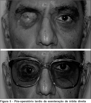 Decorrido 1 ano após o diagnóstico o paciente está sendo acompanhado em nosso serviço em processo de adaptação de prótese orbitopalpebral (Figura 5).