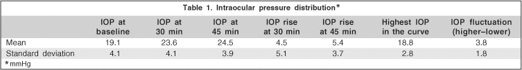 Statistical analysis was performed with SPSS (SPSS inc., Chicago, IL), version 11.5 software. The Komogorov-Smirnov test was used to assess the normality of each distribution. Pearson's correlation coefficient was used to test the linear relation between IOP after the ibopamine instillation with the highest IOP value and the IOP range (difference between the maximum and the minimum IOP recorded) in the diurnal curve. Paired Student's t test was used to analyze IOP variation before and after ibopamine instillation. The measures of agreement between the variables in the correlation was obtained with the intraclass correlation coefficient. In our study, p<0.05 was considered statistically significant.
