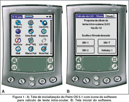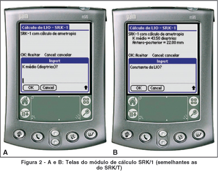 Outros programas para cálculo de lente intra-ocular podem ser encontrados na Internet(12-13). Existe uma versão em testes que está sendo desenvolvida pelo nosso grupo na linguagem JAVA (Figuras 4A e 4B). Este programa possibilita inclusive o uso de celulares com JAVA, não necessitando do custo adicional do computador de mão. Uma vez que os dispositivos móveis estão cada vez mais difundidos, o uso do software pode acompanhar esta tendência nos centros cirúrgicos oftalmológicos.