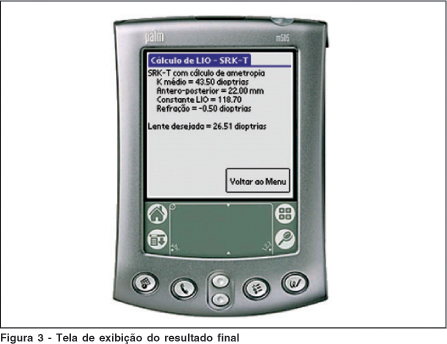 A precisão do programa testado foi semelhante a do aparelho de ultra-sonografia ocular Ultrascan, para a fórmula SRK/T. O funcionamento do programa se demonstrou estável sem travamentos nos testes efetuados. Neste trabalho demonstramos uma experiência pioneira no ramo de informática aplicada à saúde em nosso país, e a abertura de mais uma frente para exploração dos "palms" em vários ramos da medicina.