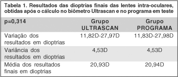 Utilizando o teste de Wilcoxon para postos assinalados, foi demonstrado que os grupos não diferiam (p=0,314). Dos 100 parâmetros testados, tivemos uma variação na amostra do grupo ULTRASCAN entre 11,82D-27,97D. Dentro da amostra do grupo PROGRAMA testado, a variação foi praticamente semelhante (11,83D-27,98D). A média da amostra do grupo ULTRASCAN foi de 20,93D. Resultado semelhante à média do grupo PROGRAMA em estudo. Os desvios-padrão das amostras também foram semelhantes (4,53D) (Tabela 1).