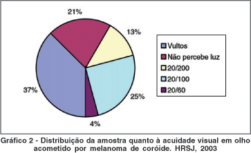 Em concordância com observado por Arcieri et al. (2002), em estudo realizado em Uberlândia, onde a maioria dos diagnósticos (66,5%) foram realizados devido a queixa de perda visual(7), no presente estudo, a diminuição da visão estava presente em 20 (83,33%) pacientes, sendo o sintoma inicial que fez com que os mesmos procurassem atendimento oftalmológico. Na literatura, em vários estudos(2,15), muitos casos de melanoma de coróide são detectados na fase inicial da doença através de exames de rotina, estando os pacientes praticamente assintomáticos. No presente estudo, o tempo do início da sintomatologia até o atendimento inicial no Serviço de Oftalmologia do HRSJ foi em média de 152,12±114,00 dias. Nenhum dos pacientes do presente estudo foi diagnosticado quando ainda assintomático através de exames oftalmológicos de rotina, o que vem a demonstrar que todos eles foram diagnosticados em estágios avançados do tumor. Este demora no atendimento inicial desnuda uma realidade preocupante, como não existem campanhas de prevenção e pelo fato de, principalmente no interior do estado de Santa Catarina, a população menos favorecida ter dificuldades para o acesso ao atendimento oftalmológico, o encaminhamento ao HRSJ, que funciona como centro de referência é demorado, retardando o correto diagnóstico e tratamento adequado, com piora do prognóstico.
