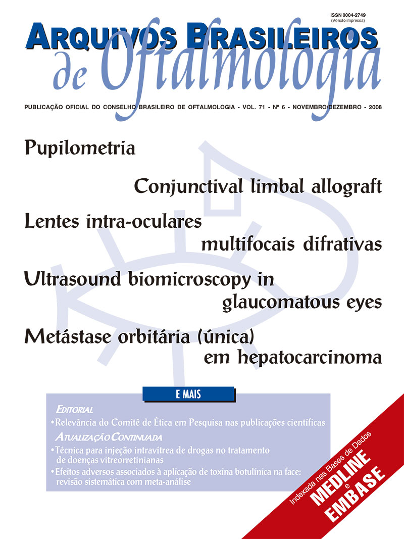 PURPOSE: To present early visual and keratometric results for corneal cross-linking with riboflavin and UV irradiation in patients with progressive keratoconus. METHODS: Twenty-five eyes of twenty patients (15 males and 5 females) with a progressive keratoconus in the previous 6 months were followed. Unaided visual acuity (UVA), best spectacle corrected visual acuity (BSCVA), spherical equivalent (SEQ), manifest cylinder, and maximal corneal curvature (max K) values were followed at 1, 3 and 6 months. All patients were submitted to corneal cross-linking using riboflavin (vitamin B2) as the photosensitizer and ultraviolet light (UV, wavelength 370 nm). Epithelium was removed with 20% alcohol, cornea was soaked with vitamin B2 for 15 min, and then irradiated with UV light for 30 min, after which a bandage contact lens (BCL) was placed. RESULTS: UVA increased after one month (from 0.15 ± 0.15 to 0.23 ± 0.20), and went on increasing at 3 and 6 months, reaching statistical significance (p=0.025 e p=0.037, respectively). BSCVA increased from 0.41 ± 0.27 to 0.49 ± 0.29 at month six, without reaching statistical significance at any time point. Progression of keratoconus stopped in all patients, in contrast with progression in all of them in the six-month period prior to the surgery. Max K decreased by more than 2 D (from 53.02 ± 8.42 to 50.88 ± 6.05 D), SEQ less that 1 D (from -3.27 ± 4.08 to -2.68 ± 3.02 D), while refractive cylinder decreased less than 0.5 D (from -2.29 ± 1.77 to -1.86 ± 0.92 D), without reaching a statistically significant difference. None of the eyes lost any line of BSCVA, 12 maintained the preoperative BSCVA, 7 gained one line, 5 gained two lines, and 1 patient gained three lines of BSCVA. CONCLUSIONS: Corneal cross-linking with riboflavin and UV light seems to be a safe (no loss of BSCVA) and effective (anatomical and optical properties maintained) procedure, which has shown to stop the progression of the keratoconus: a reduction, although not statistically significant, of the corneal curvature, spherical equivalent and refractive cylinder took place in patients where previous progression of keratoconus had been described.